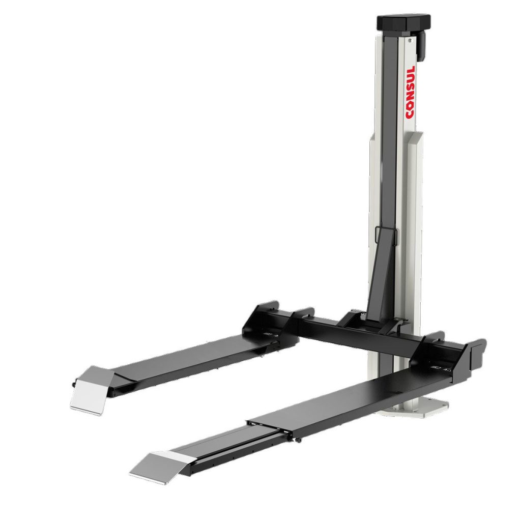 A Consul Premium EL® 2.35 EV This two-post lift was developed specifically tailored to the needs of modern vehicle fleets, especially electric vehicles (EVs). The specially designed angled support arm ends ensure optimal access to the batteries and underbody, significantly facilitating the servicing and maintenance of electric vehicles. This lift combines reliability, precise control, and excellent ergonomics, making it the ideal choice for any professional workshop.