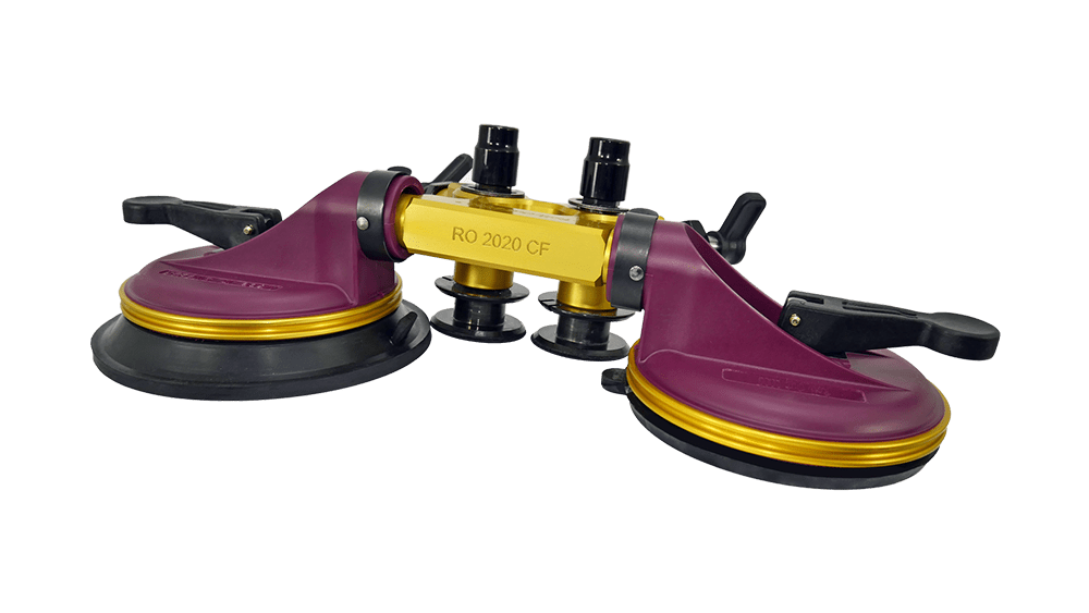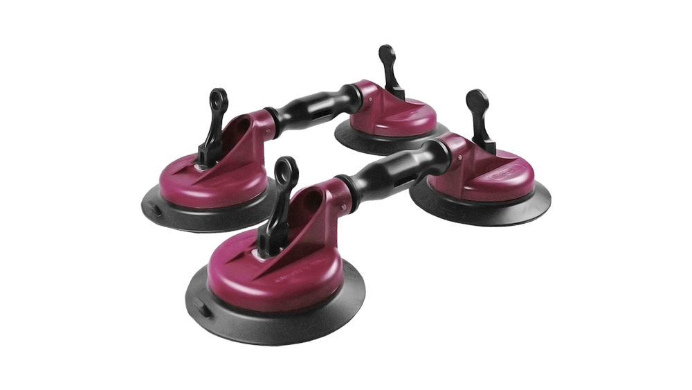 Description: Articulated suction lifter with powerful vacuum and 150 mm rubber cups, ideal for transporting and installing curved automotive front windshields. The movable suction cups and extension holes make it perfectly suitable for strongly curved surfaces. The large rubber cups ensure excellent quality, shape retention, and optimal adaptation under vacuum. Ergonomically designed tilting levers for perfect power transmission. The release tab on the rubber cup facilitates removal.