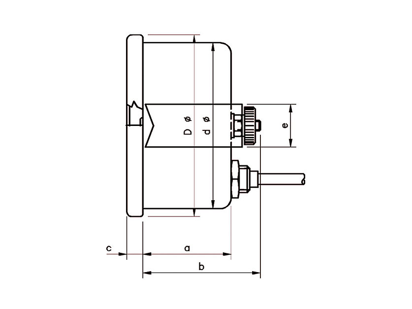 Note: The parameters ‘a’, ‘b’, ‘c’, ‘D’, ‘e’ listed in the table indicate the specific installation and physical dimensions of the instrument. The designation „KB/V” likely refers to bimetallic compensation and V-clamp fixing.