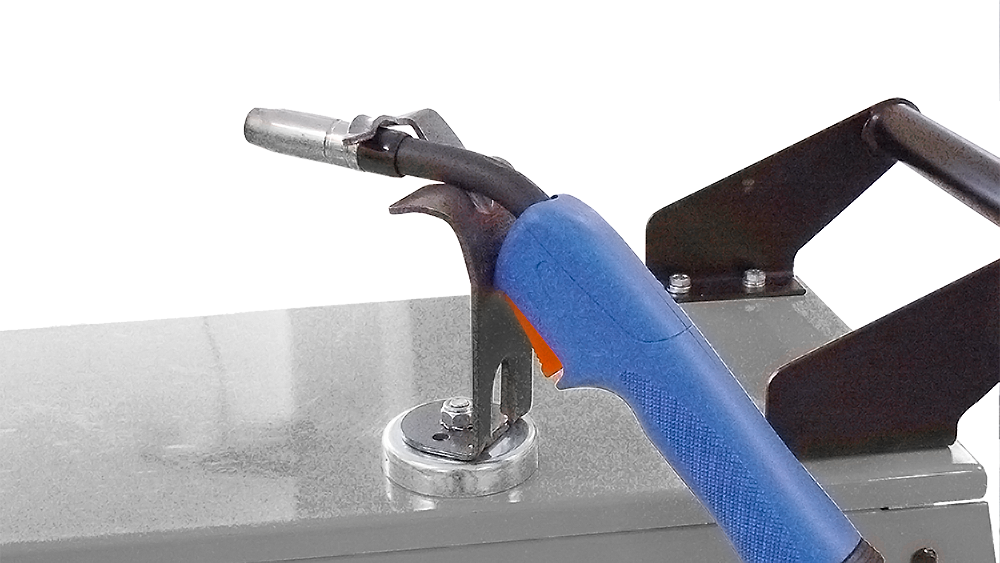 This accessory significantly increases workshop organization and the safety of the welding process, as the torch is always at hand but securely fixed when not in use.