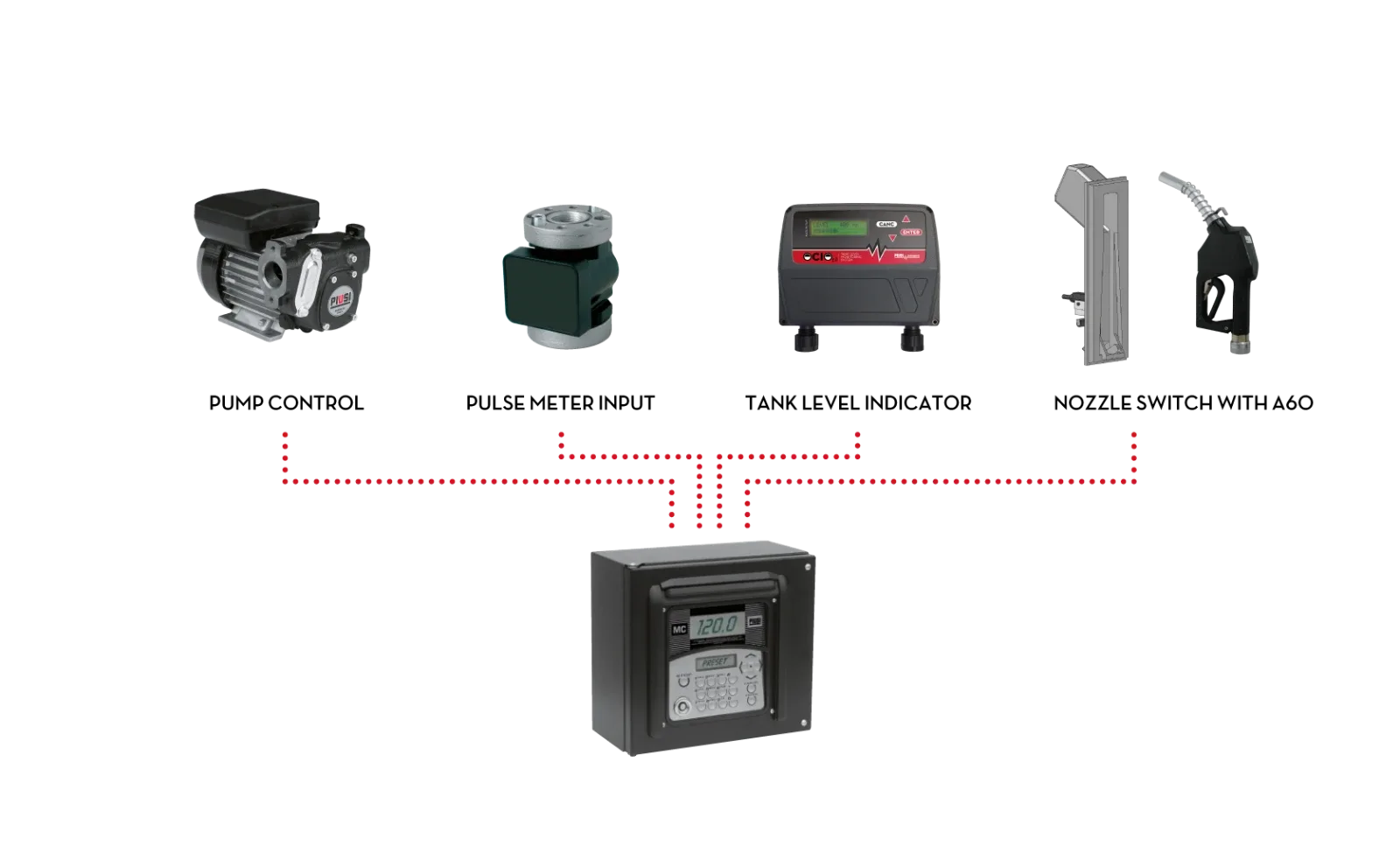 The MCBOX 2.0 forms an electronic panel to which the system pump, an electronic flow meter, a fuel nozzle contact (microswitch), and an optional external printer can be directly connected. The system ensures intelligent control over the entire dispensing process.