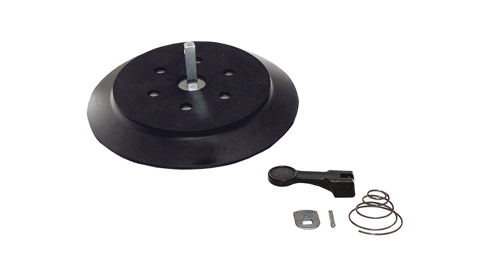 Description: This kit combines the twist lever for suction cups of edge remover systems with a 150 mm diameter. Contents: 1 pc Rubber Ø 150 mm, 1 pc Spring, 1 pc Retaining Pin, 1 pc Washer, 1 pc Twist Lever.