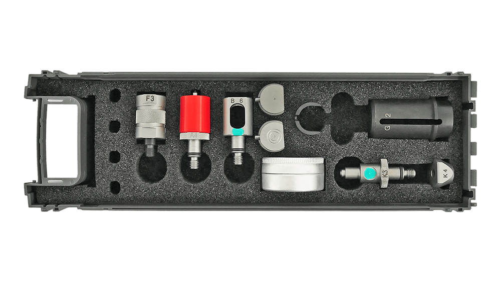 A Tool Box RS-08/3 | Tesla (Part No.: 700198) is a carefully assembled set containing the following basic elements: | Part No. | Description | Details | | :------ | :--- | :--- | | 700341 A4 | Pull stud | Pull stud equipped with a polyurethane spring. | | 700353 | Drill and calibrating tool set | For precise drilling and dimensioning of $text{Ø 8 mm}$ diameter holes. | | 700349 K3 + K4 | Drilling and forming tool | For drilling and subsequent forming of $text{Ø 8 mm}$ diameter holes. | | 700337 F3 | Extension | $text{26 mm}$ long accessory for increasing the working distance. | | 700280 Z1 | Connector | Element for connecting system components. | | SKR | Rivet crown | For $text{Ø 8 mm}$ diameter rivets. Package contents: 20 pieces/package (PU: 20 pcs.). |