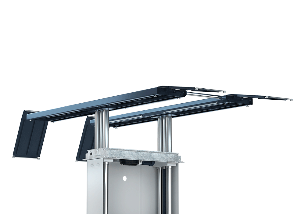 The TwinRam 50.1 A/1500 is a two-ram lift complemented by approach ramps. This configuration is ideal for workshops where fast and safe loading and unloading of vehicles is crucial.