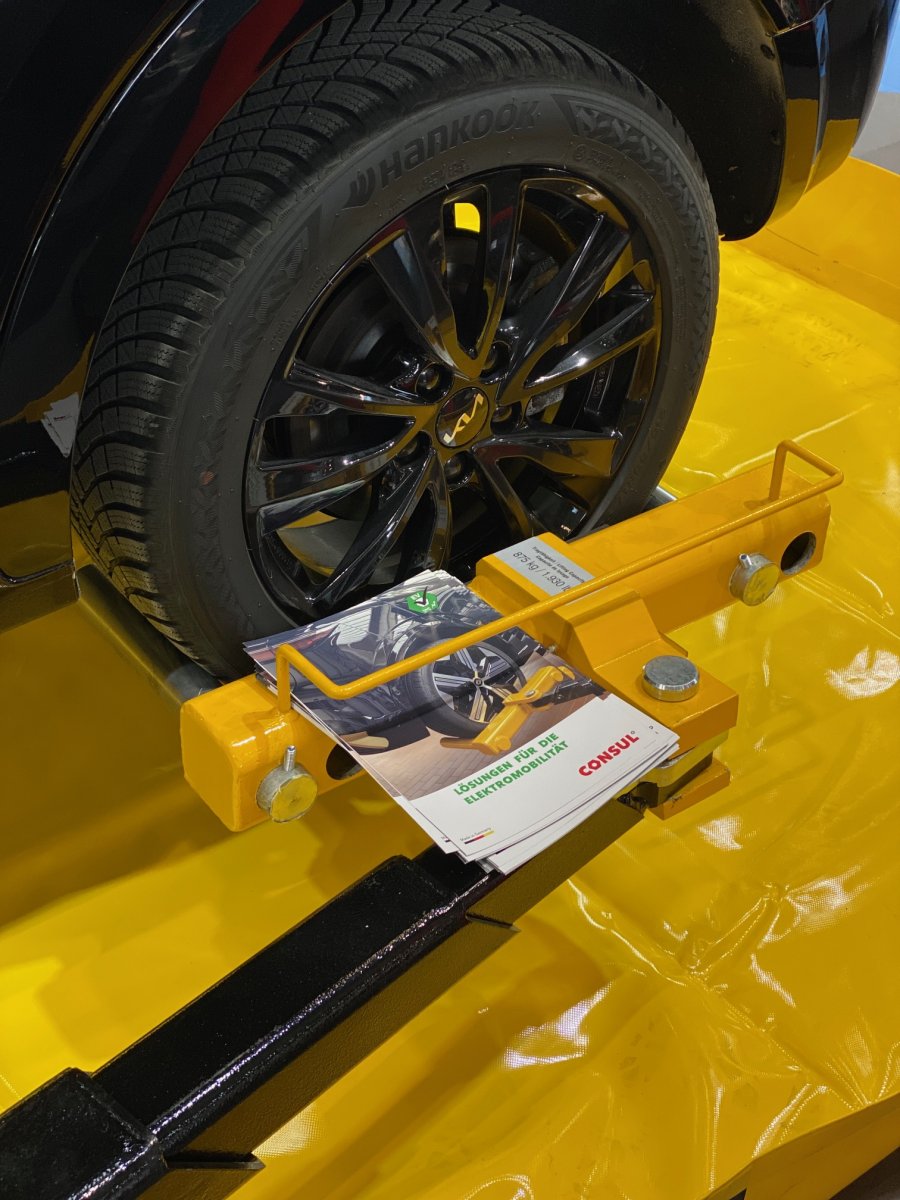 Távolságtartó: Rugós ajtóütközők és állítható tányérok (Ø 120 mm, kb. 30 mm elmozdulással) segítik a járművek pontos pozicionálását.