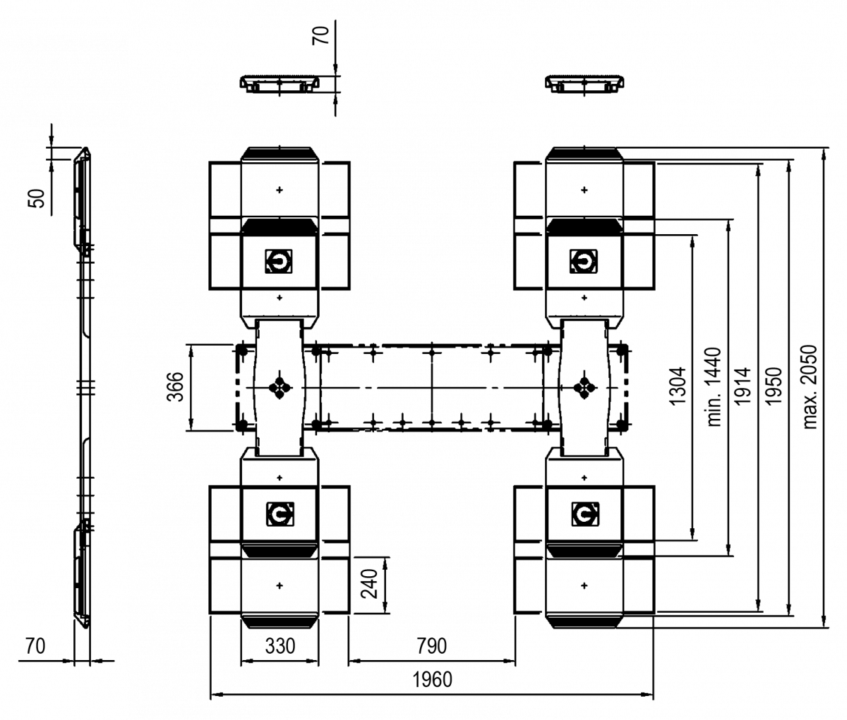 Karok és Tányérok: Párnázott ajtóütköző és állítható emelőtalp (kb. 30 mm) a járművek kíméletes felfektetéséhez.