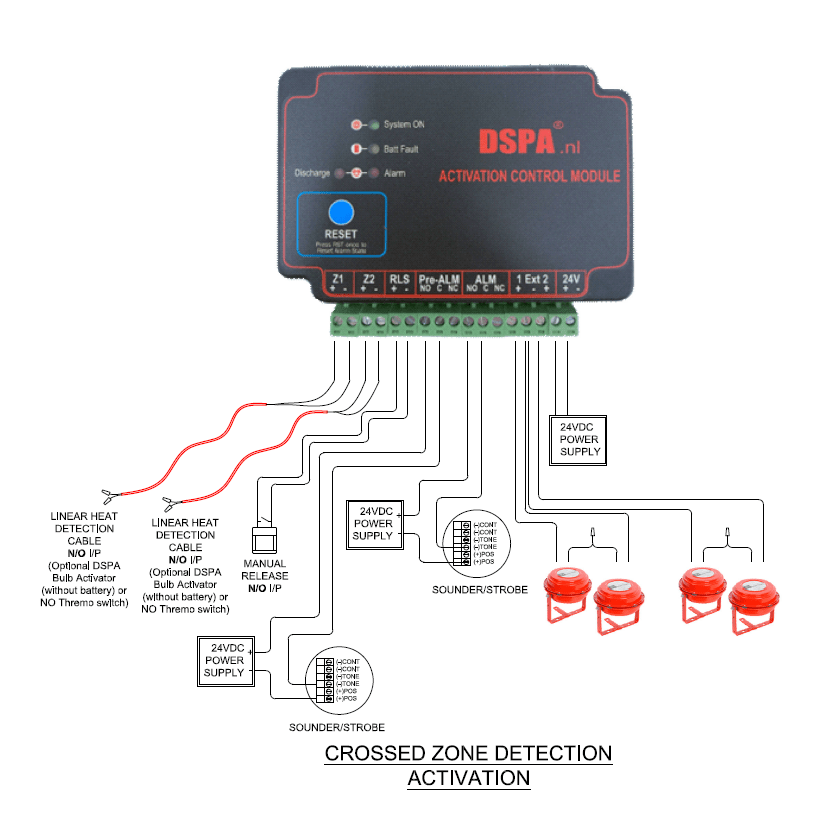 A DSPA Aktiváló Vezérlő Modul lehetővé teszi az alapvető automata tűzoltás megvalósítását DSPA aeroszol generátorokkal. Az áramellátás 2 db 3V CR123A beépített elemmel és/vagy külső 24Vdc tápellátással történik. Két külső érzékelő vagy kapcsoló aktiválja a DSPA Aktiváló Vezérlő Modult 5 másodperces előriasztási idővel az oltóanyag kilövése előtt. A modul akár 4 DSPA aeroszol generátort is képes aktiválni (Ext 1-2 kimenet). A modul 2 potenciálmentes riasztási érintkezővel rendelkezik, 1 az Előriasztáshoz és 1 a Riasztáshoz (első és második fokozatú riasztás). Minden érintkező használható Nyitottként (NO) és Zártként (NC) is. Az Előriasztás érintkező szellőztető berendezések lekapcsolására is használható. Ezeket nagy kockázatú, kis helyigényű területeken, például elektromos szekrényekben, gépházakban stb. telepítik. Tulajdonságok: 2 zónás tűzérzékelés, Manuális indító bemenet, Visszaállító kulcs a riasztás reteszeléséből való kilépéshez, Előriasztás és Riasztás jelzése, Akár 4 DSPA generátor csatlakoztatása, Elemekkel működtetett, 5 év élettartam, Opcionális 24Vdc külső tápellátás, Egyedülállóan egyszerű telepítés és karbantartás, Nagyon költséghatékony.