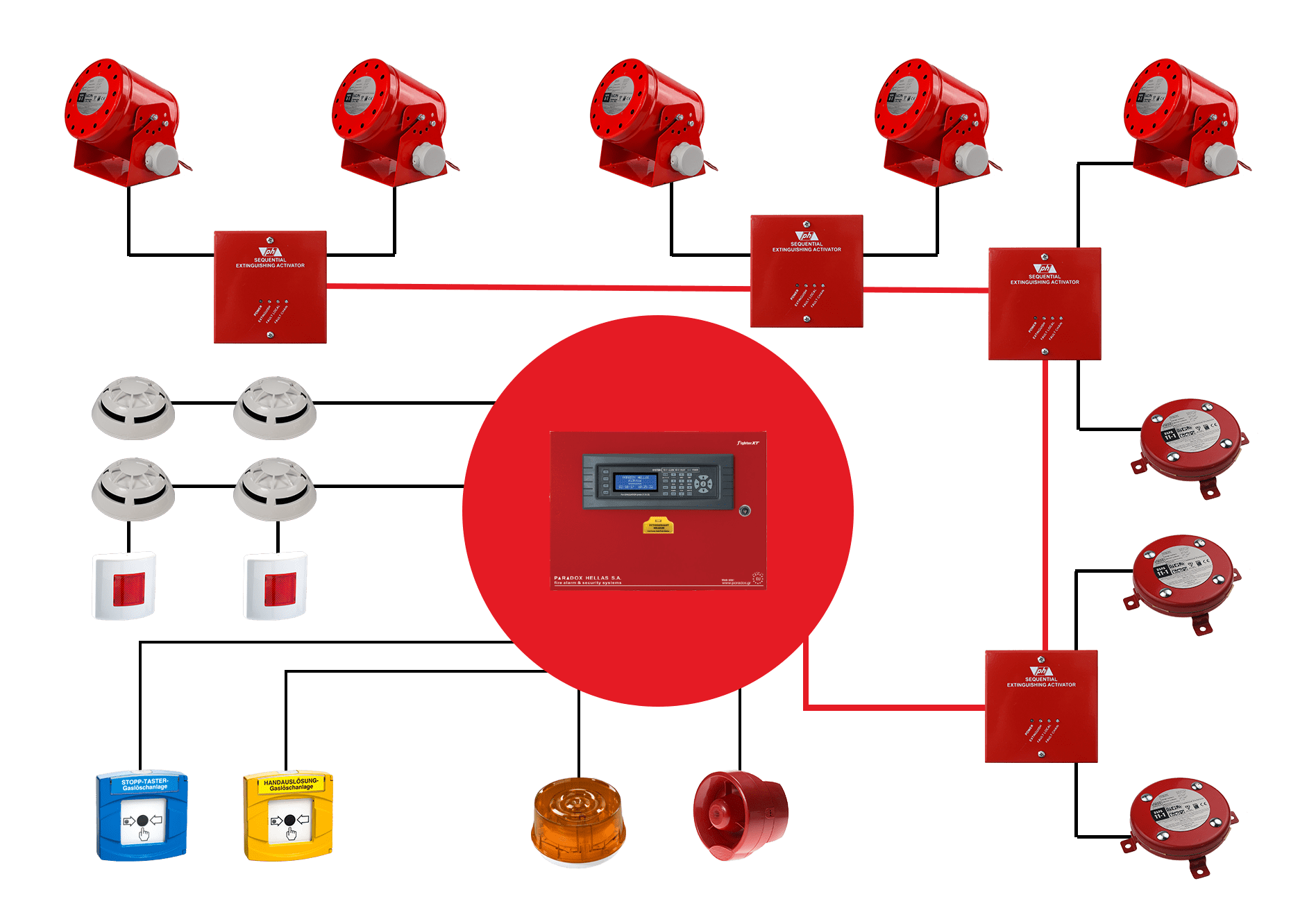 A DSPA fix aeroszolos oltórendszer a DSPA aeroszol-generátorok egyedi technológiáját ötvözi a Labour & Strauss (LST) és a Paradox Hellas – Svesis kiváló minőségű tűzjelző központjaival és tartozékaival. Közösen egyedülállóan biztonságos és megbízható rendszert fejlesztettünk ki, amely generátorainkhoz van szabva, számos alkalmazási területen használható, mint például szerverterek, raktárak, archívumok stb., és teljes mértékben tanúsított. A DSPA aeroszol rendszer tervezése térfogatarányos jellegű. Minden telepítés egyedi. Magasan képzett mérnökeink teljes rendszert terveznek Önnek, amely érzékelők, DSPA aeroszol-generátorok és egyéb komponensek kombinációját fogja tartalmazni. Kisebb aeroszol-generátorokat apró és szűk terekhez, míg nagyobb generátorokat kiterjedtebb szerkezetekhez alkalmazunk. A telepítendő DSPA aeroszol-generátorok mennyisége megfelel az oltóanyagunk, az aeroszol tervezési mennyiségének. Az aeroszol, mint oltóanyag, sokszor hatékonyabb, mint a gáz- vagy egyéb hagyományos oltóanyagok. Bármilyen tűz eloltásához csak nagyon kis mennyiségre van szükség. A BC06-2EXT/INT11 és a Fighter XT kombinált tűzérzékelő/oltóvezérlő központok az EN15276-2 szabványnak megfelelő aeroszolos oltórendszerek felügyeletére és vezérlésére szolgálnak. A központhoz való közvetlen csatlakozás maximum 4 DSPA aeroszol-generátor aktiválását teszi lehetővé. A szabadalmaztatott Univerzális Aktiváló Rendszerünknek (UAS) köszönhetően ez a rendszer teljesen skálázható és bővíthető. Aktiváláskor egyetlen korszerűsített rendszerközpont akár 400 DSPA aeroszol-generátor egységet is képes szimultán működtetni. Jellemzők: Bővíthető rendszer kis vagy nagy alkalmazásokhoz, 4 detektor zóna hagyományos technológiával, Tiszta állapotjelzés és egyszerű kezelés a központ előlapján, EN54, EN12094-1, VdS tanúsítvánnyal rendelkezik, EN15276-2 szabványnak megfelel.