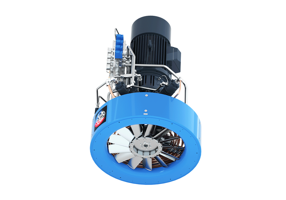 A négyfokozatú kialakítás lehetővé teszi a nitrogén hatékony és kontrollált felépítését a 350 bar végnyomásig. Minden egyes fokozat optimális kompressziót biztosít, minimalizálva a hőtermelést a köztes hűtők segítségével. A 4 henger biztosítja a szükséges löketszámot a megadott térfogatáram eléréséhez.
