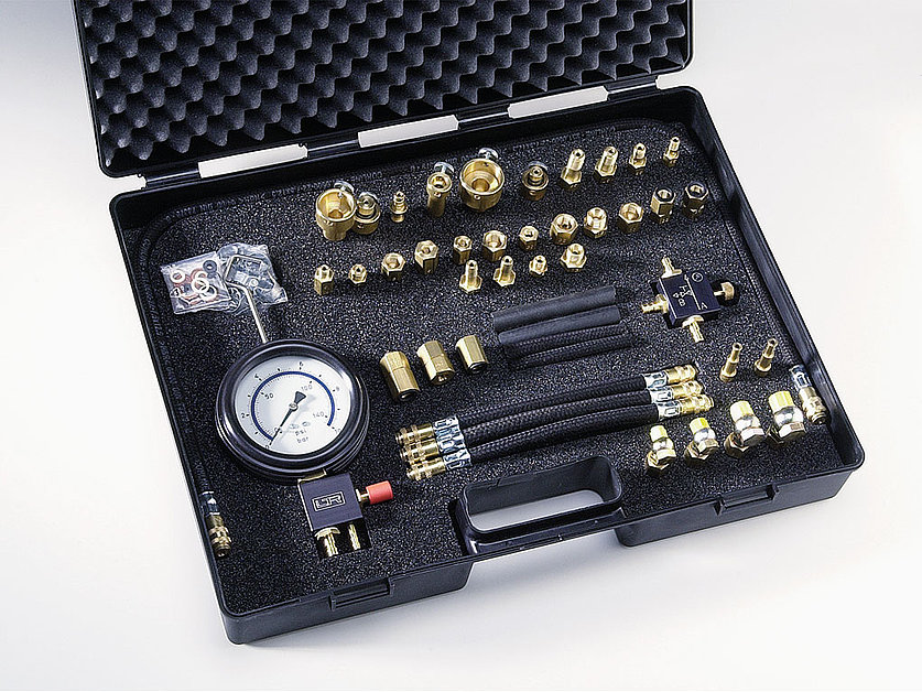 Szivárgásvizsgálat: A befecskendezők visszatérő áramlásának mérése (amennyiben a készlet tartalmazza a visszatérő áramlás mérő adaptereket is, vagy a nyomásmérővel kiegészíthető).