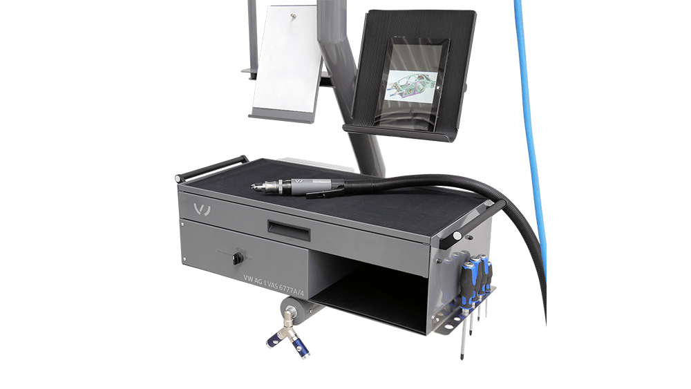 Tablettartó: Fix, gumírozott hellyel rendelkezik egy tablett számára, amely ideális digitális munkautasítások, rajzok vagy diagnosztikai adatok megjelenítésére a munkavégzés közben.