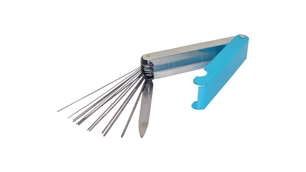 Kompakt, 13 részes készlet praktikus, zsanéros fém dobozban. Tartalmaz kb. 90 mm hosszú tűreszelőket (0,4-1,6 mm) és egy lapos reszelőt – ideális oxigén-üzemű hegesztőfúvókák tisztításához.