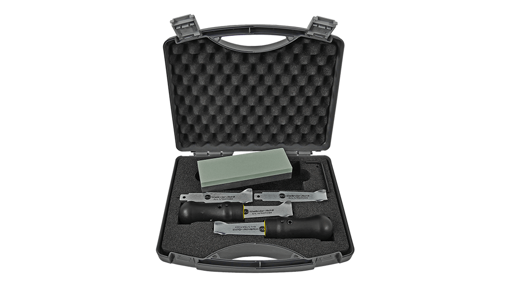 A készlet tartalmaz egy szilícium-karbidból készült padkövet (élezőkövet). Ez a kiegészítő lehetővé teszi a felhasználó számára, hogy a munkafolyamatok során rendszeresen élezze és karbantartsa a kaparópengéket. A megfelelő élesség fenntartása kulcsfontosságú a hatékony munkavégzéshez és a szerszámok hosszú élettartamához. A 4 mm-es imbuszkulcsot a pengék rögzítésének vagy cseréjének megkönnyítésére biztosítják.