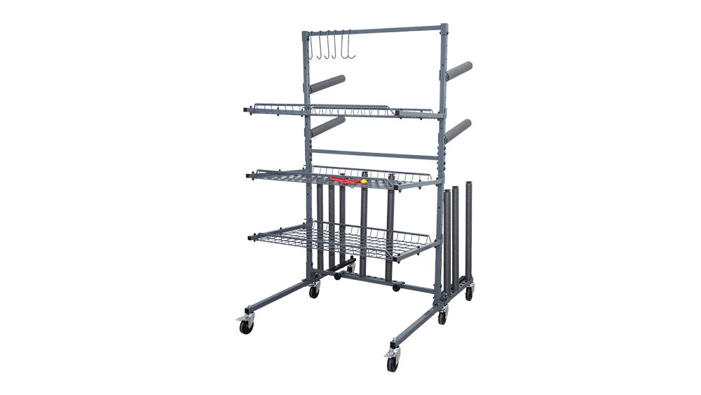 Ez a mobil tárolórendszer helytakarékos megoldást kínál a műhely felszereléseinek tárolására.
